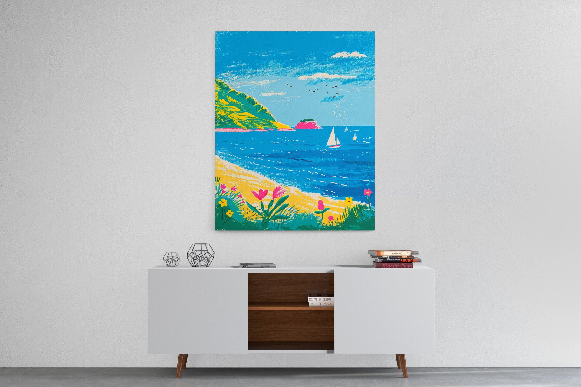 Kustlandschap met blauwe zee en zeilboot