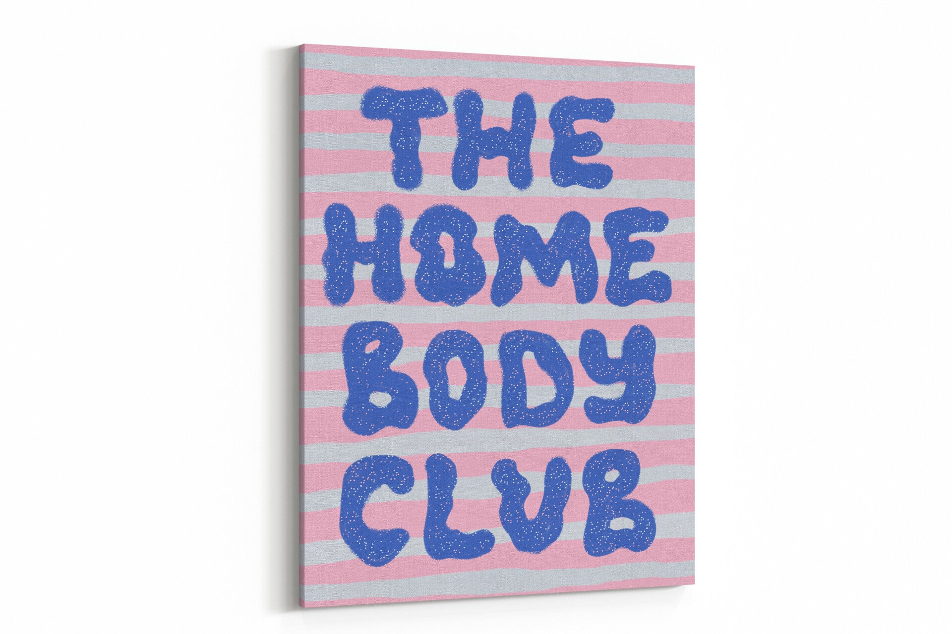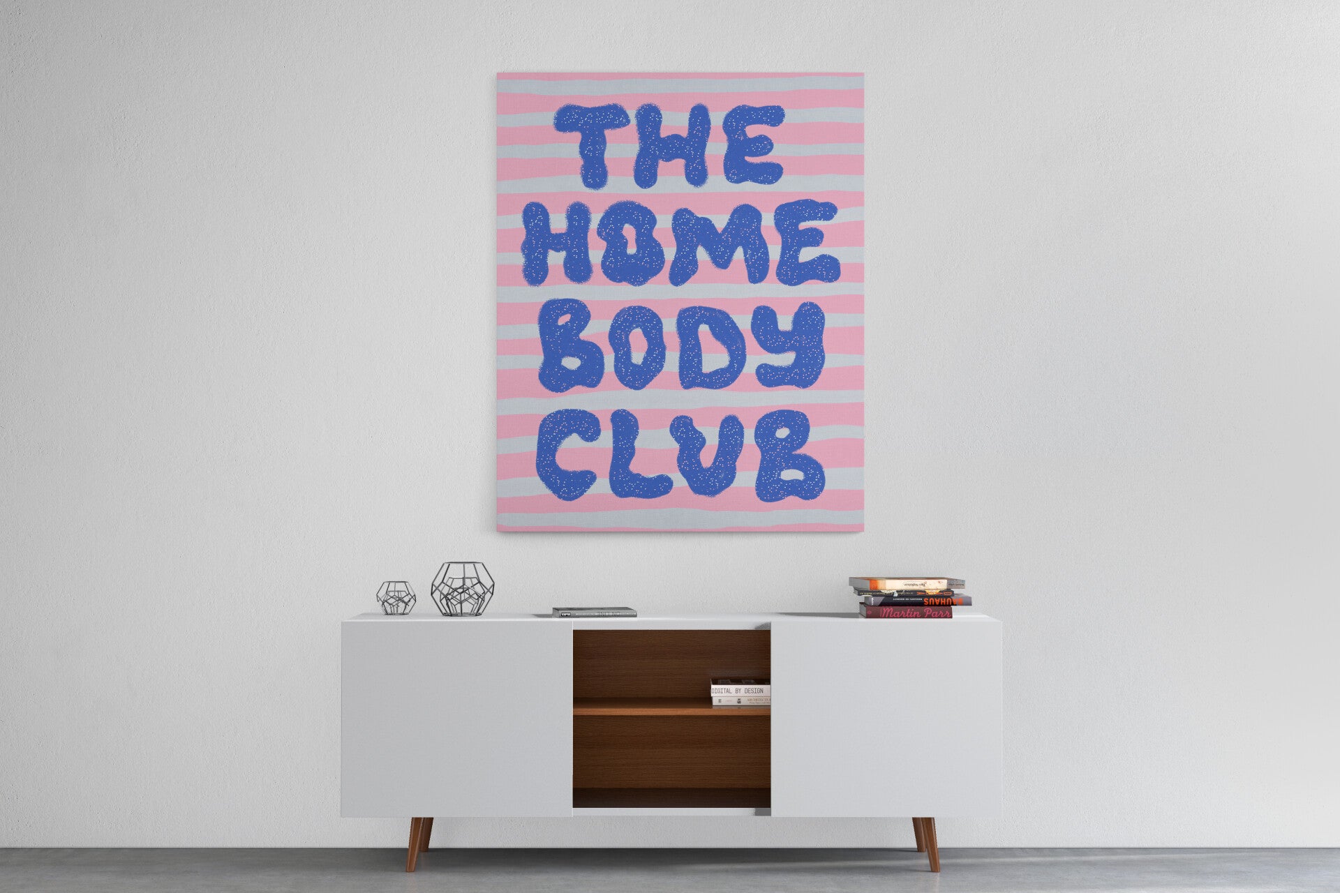 Quote 'the home body club' op een roze gestreepte achtergrond