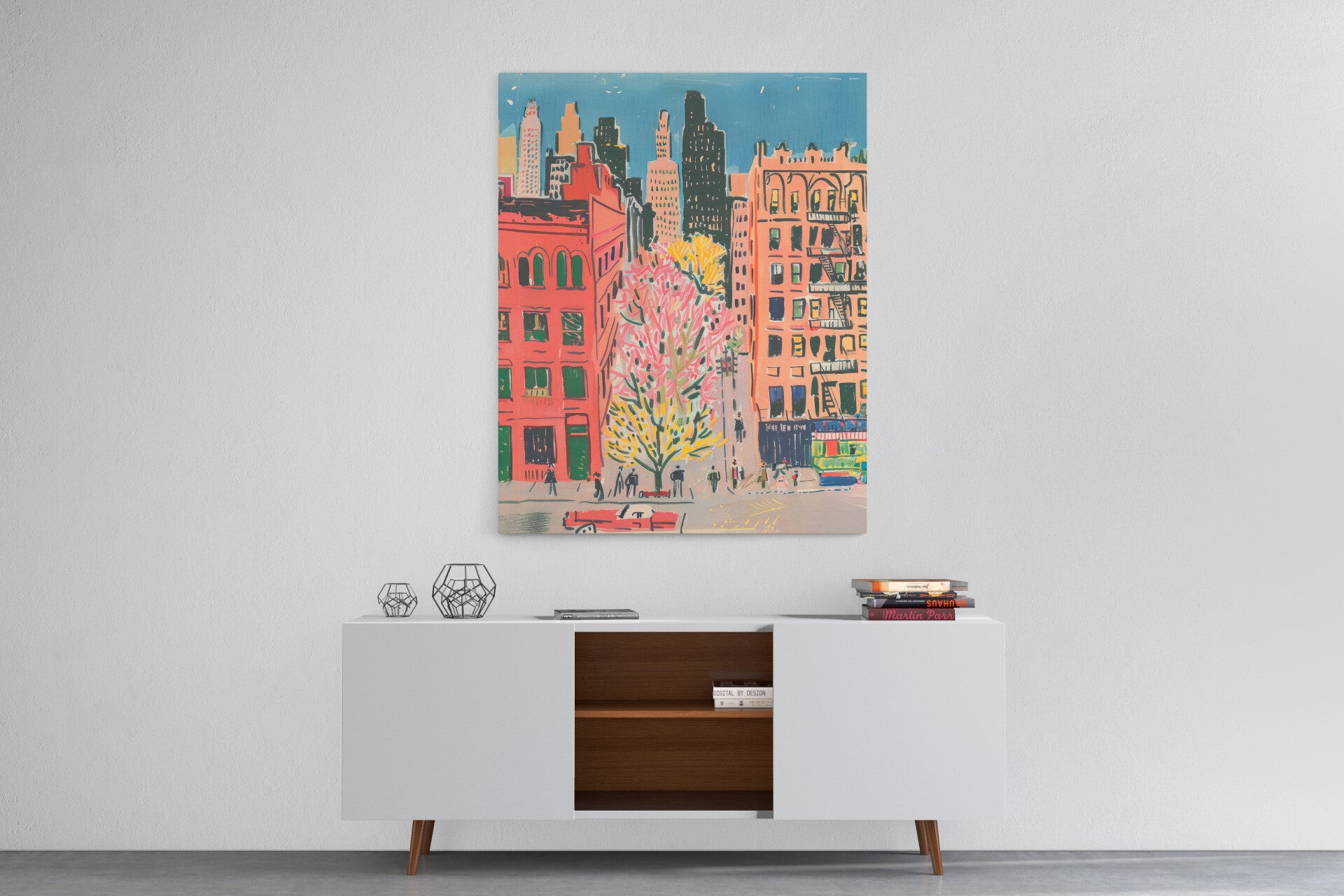 Kleurrijke stadsscène met hoge gebouwen en bomen