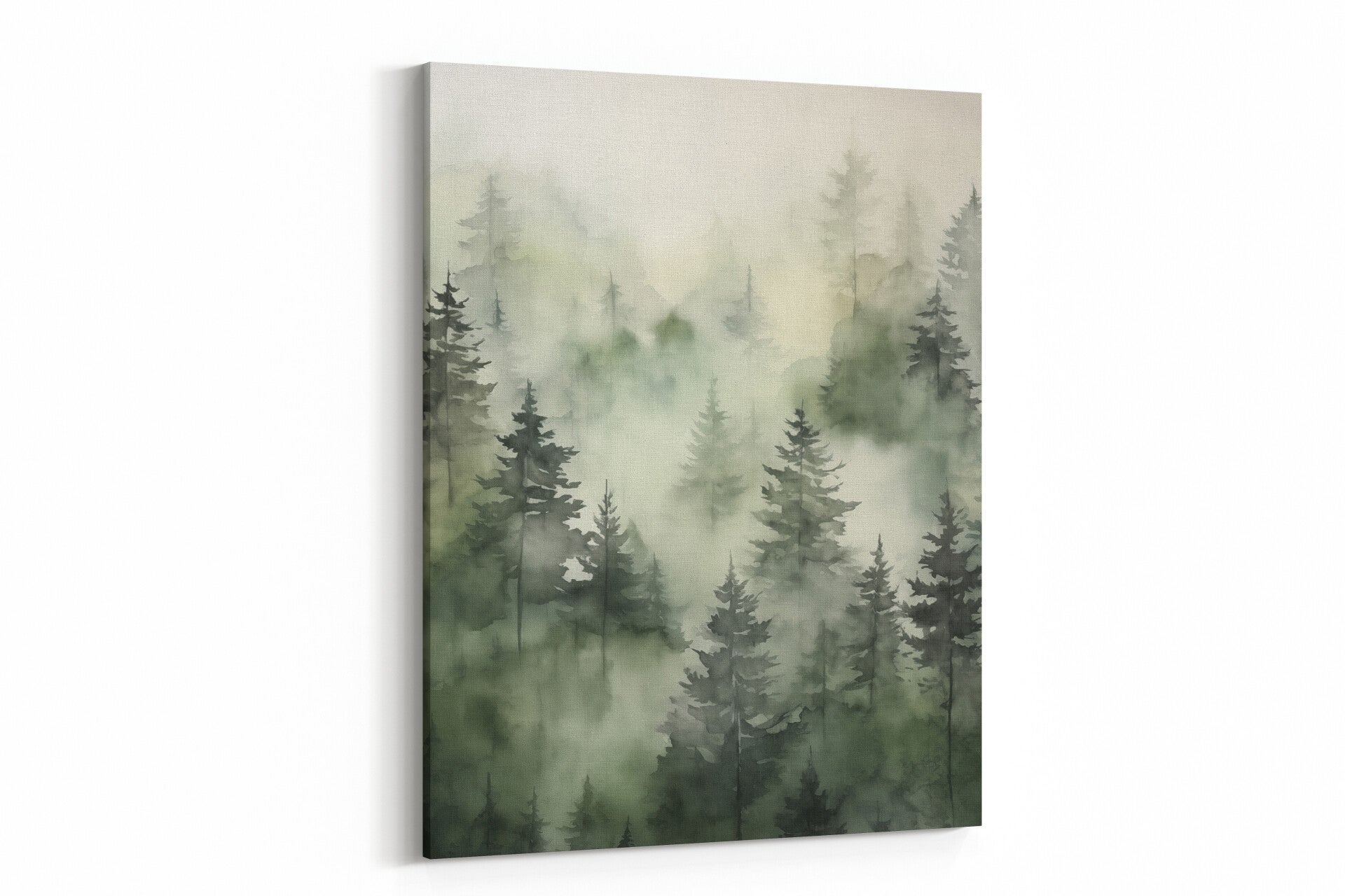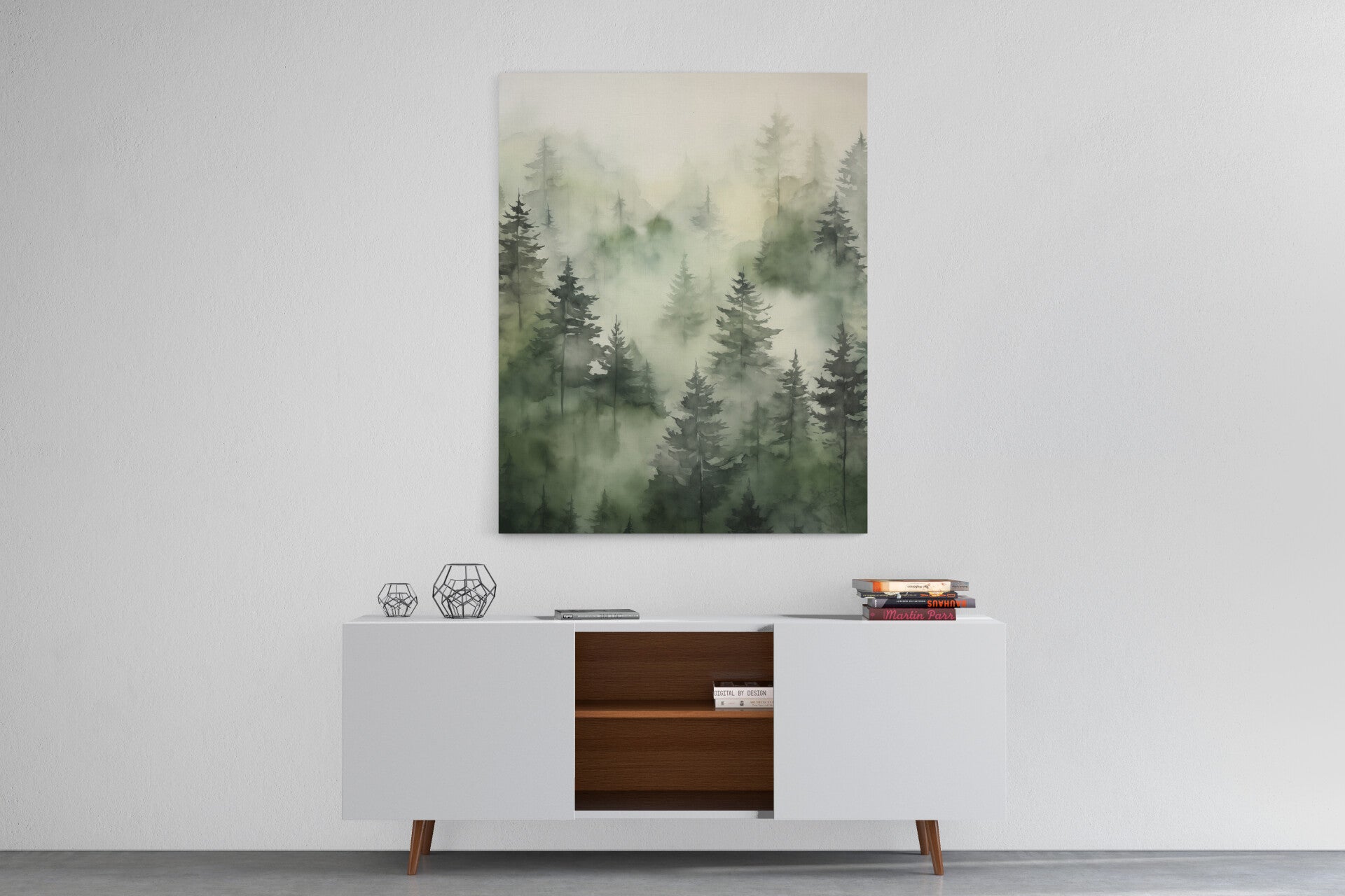 Een minimalistische weergave van een naaldbos in zachte groentinten