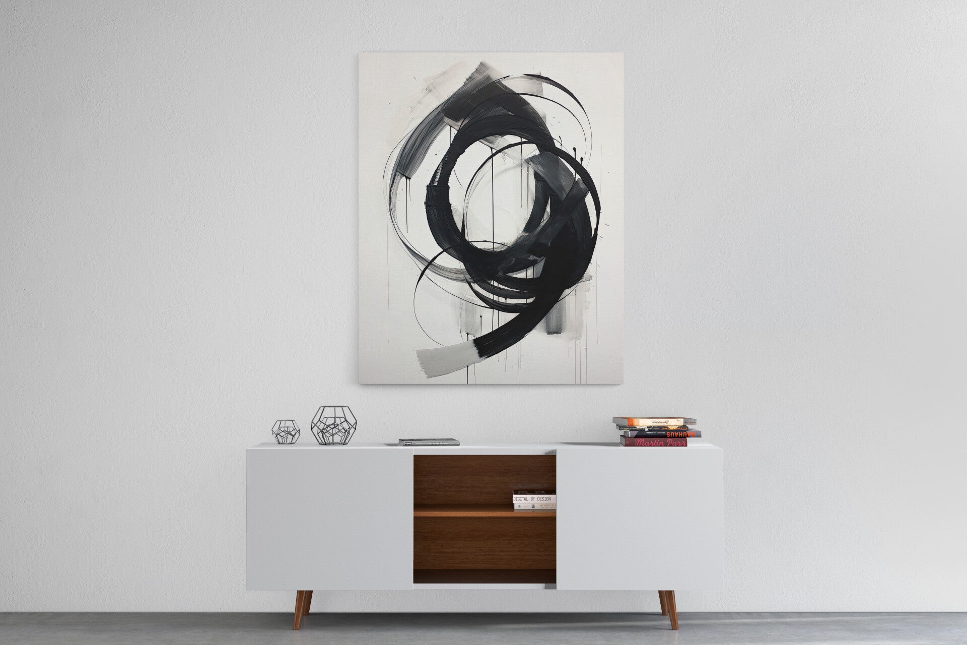 Expressieve penseelstreken in zwart-wit, met een dynamische draai