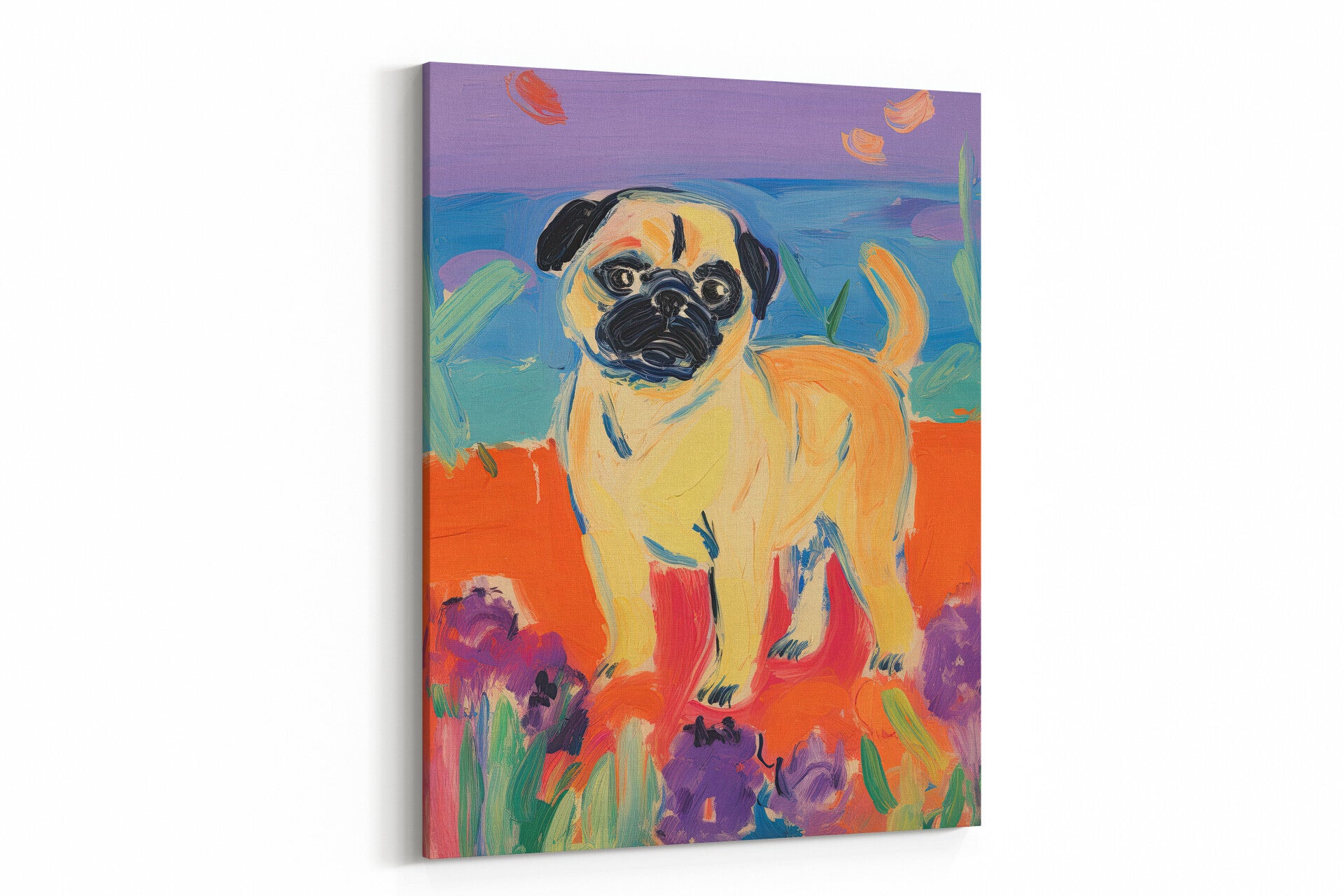 Een schattige mops in een fantasierijk landschap