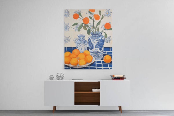 Een stilleven met blauwe tegels, een vaas en sinaasappels