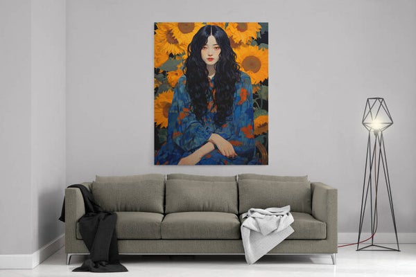 Portret van een vrouw omringd door zonnebloemen, mysterieus en krachtig.