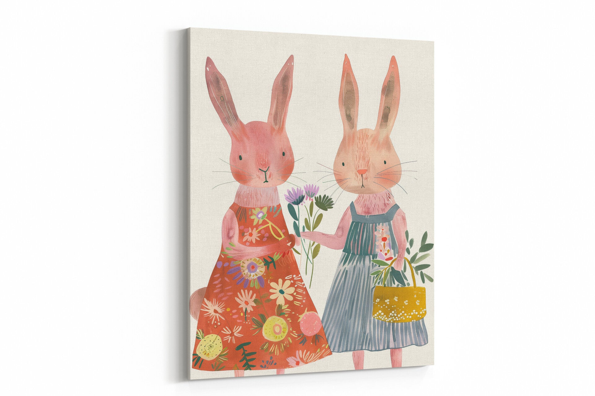 Twee modieus geklede konijnen met bloemen