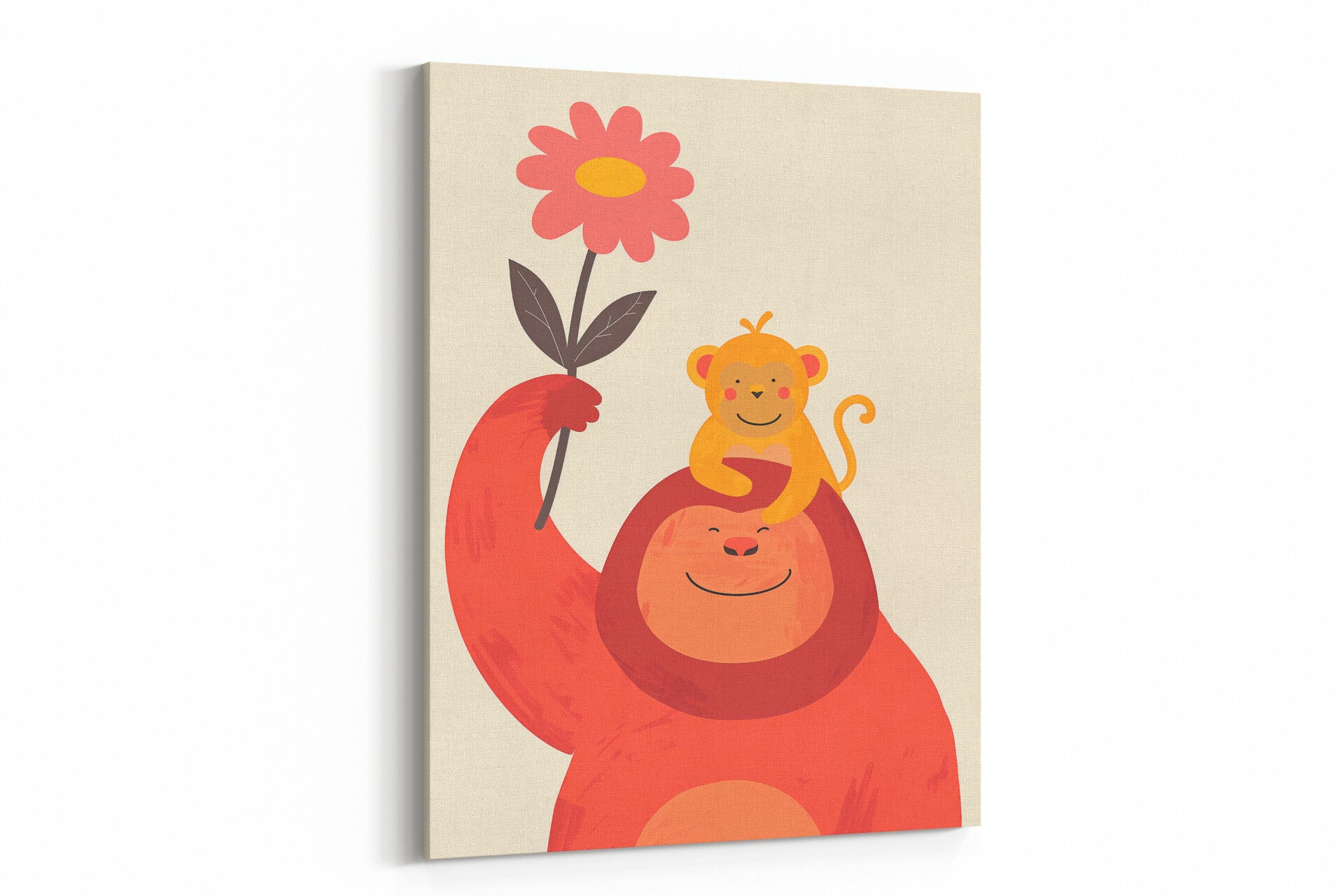 Een vriendelijke orang-oetan die een bloem omhoog houdt in een vrolijk tafereel