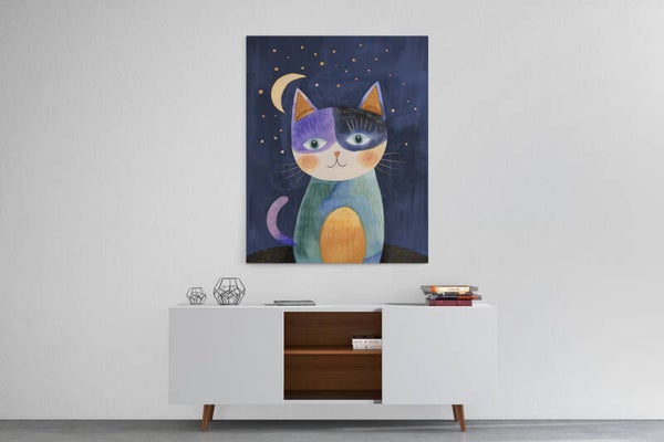 Een kat met grote ogen, omringd door een magische nachtelijke sfeer