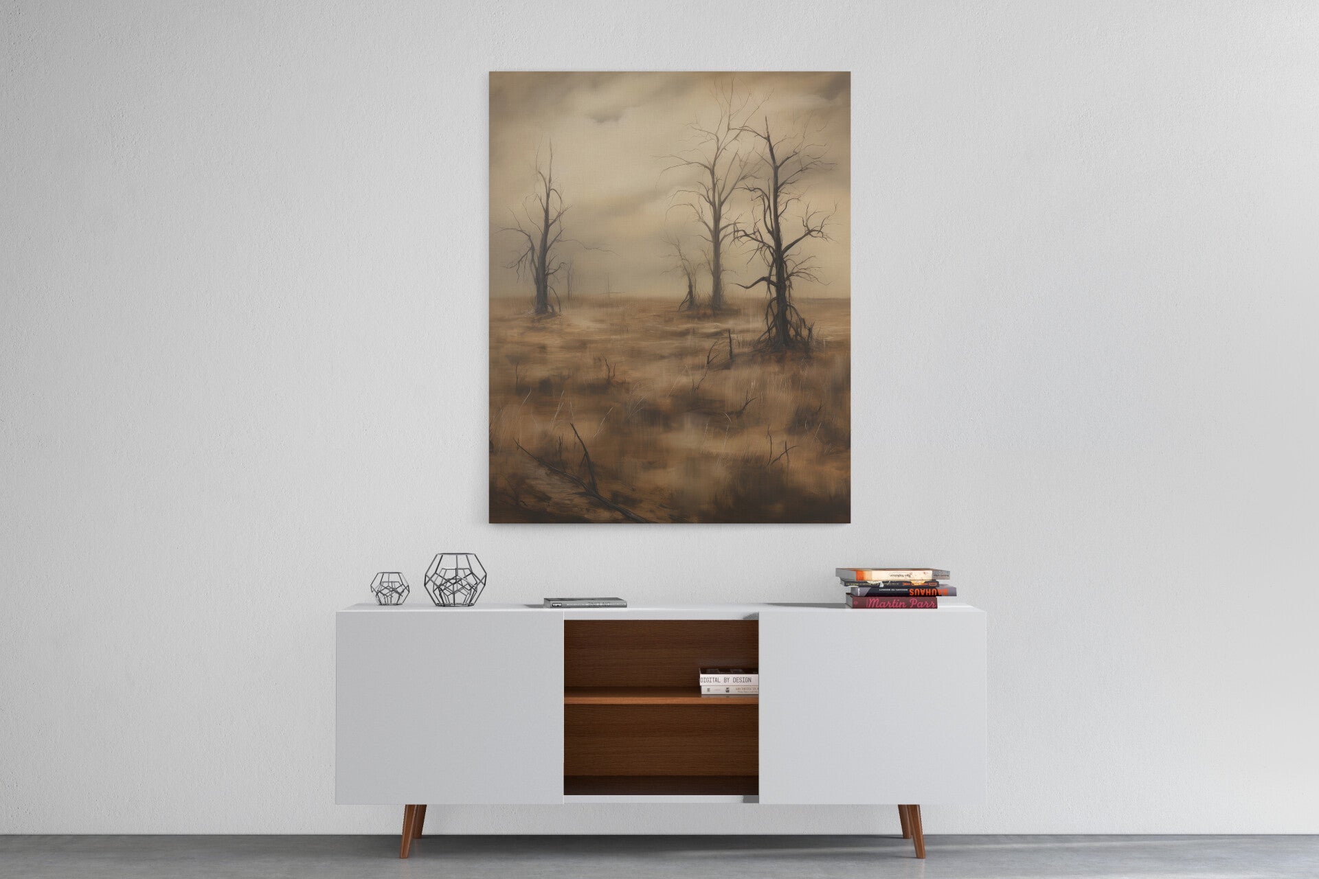 Kale bomen in mistig veld