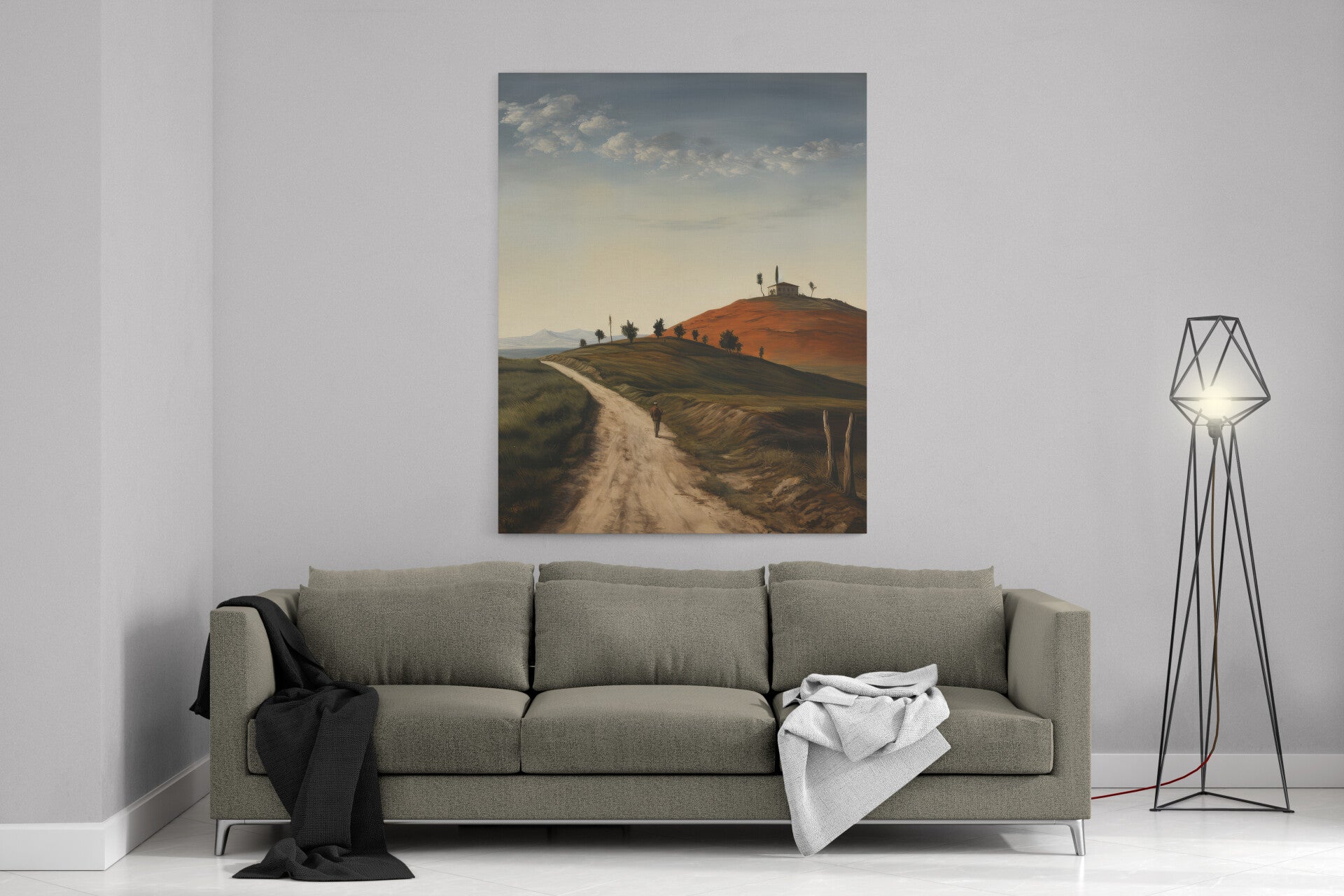 Landschap met heuvel en huis bij zonsondergang