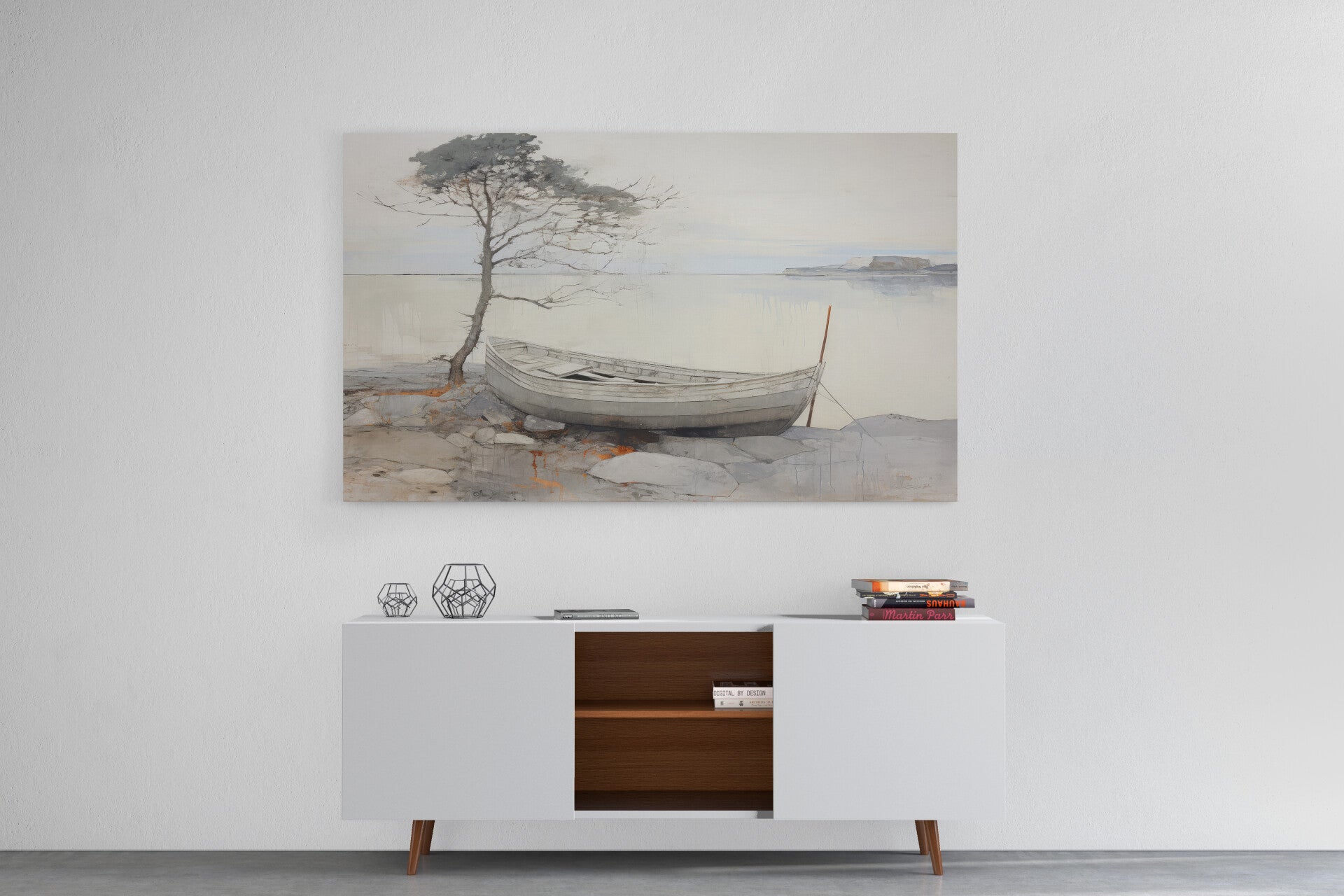 Zwart-wit schets van een boot bij een boom