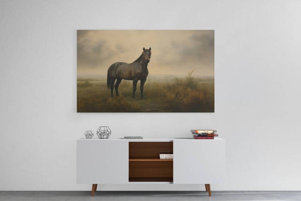 Zwart paard in een mistige weide