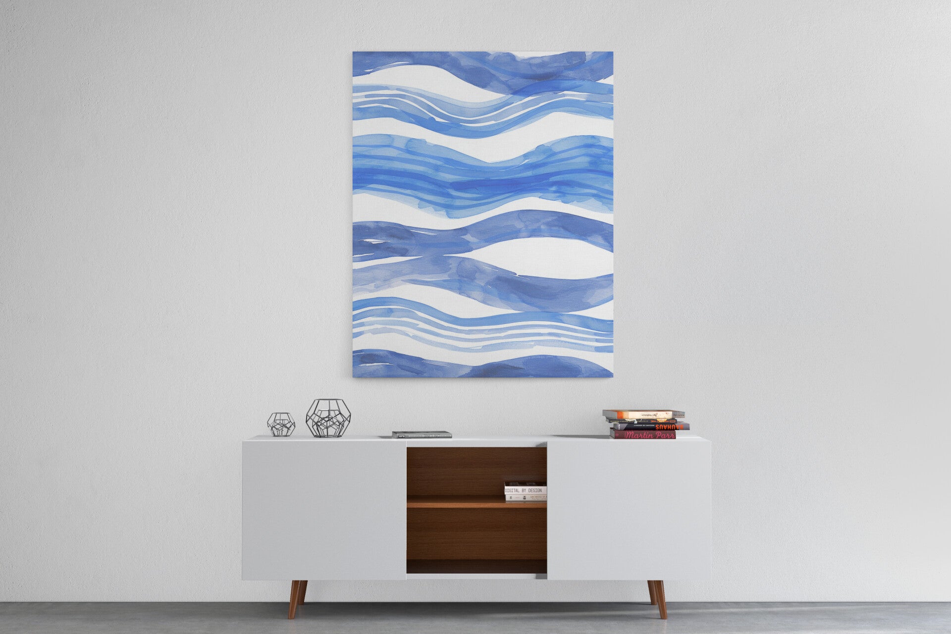 Een artistiek golvend patroon in blauw en wit, geïnspireerd door oceaangolven