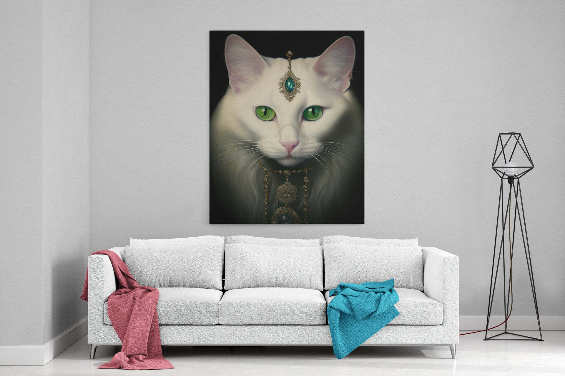 Een witte kat met intense groene ogen en een koninklijke uitstraling