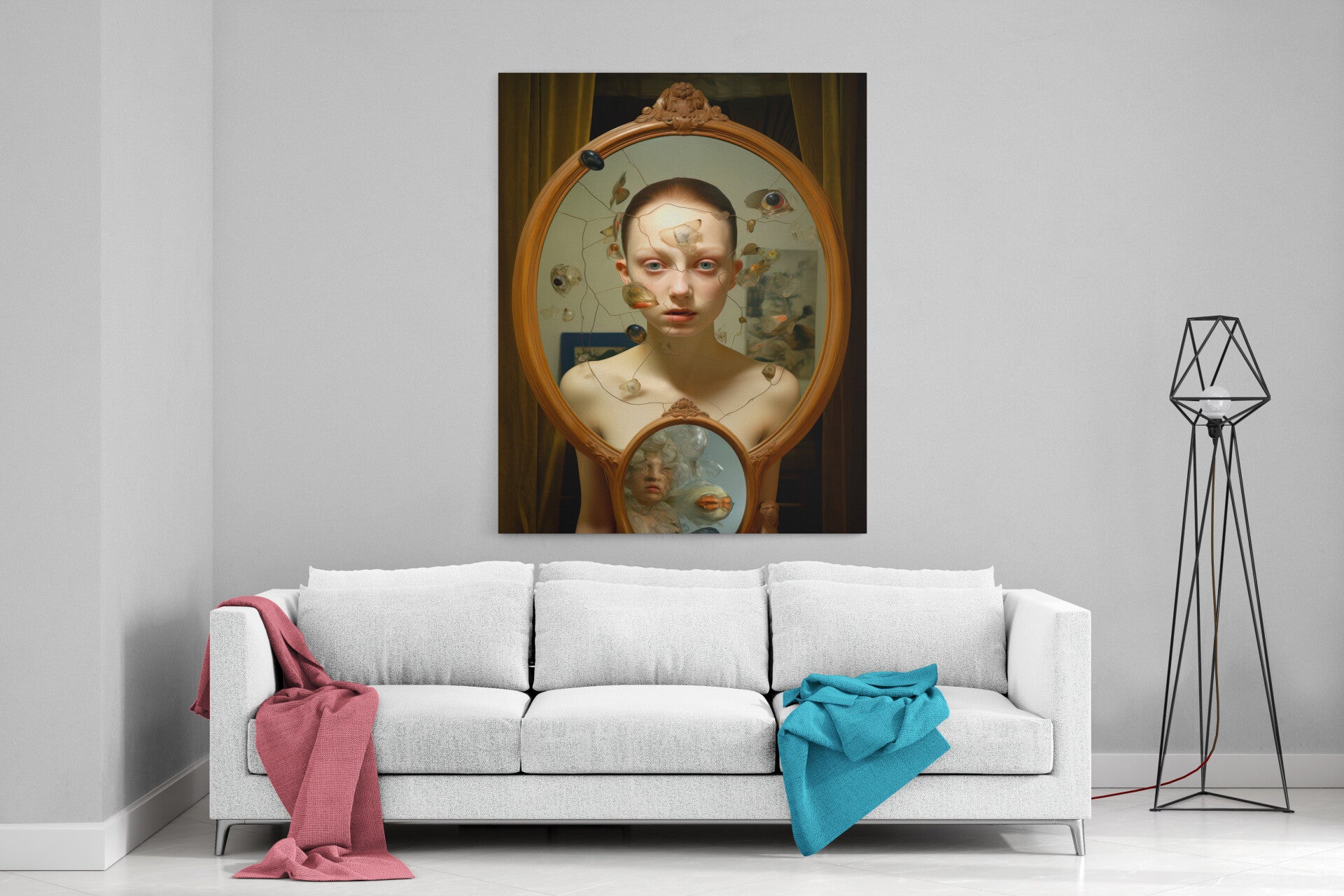 Een surrealistische compositie waarin een vrouw haar eigen spiegelbeeld op een unieke manier waarneemt