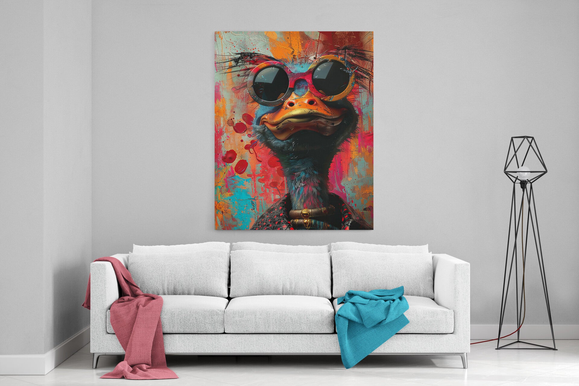 Retro geïnspireerde eend met kleurrijke verfspatten en urban vibes.