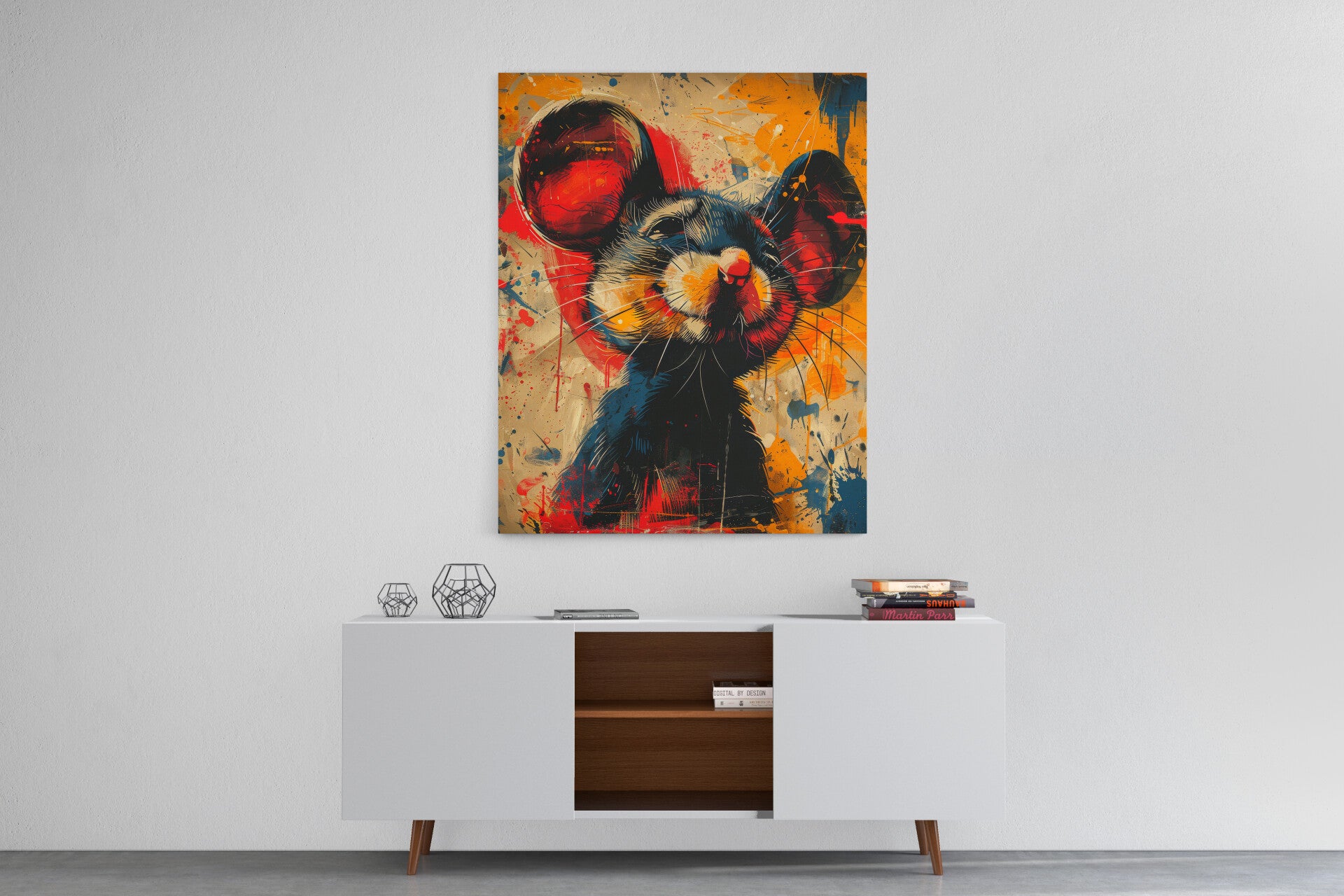 Een kunstzinnige muis met levendige kleuren en een dynamische compositie