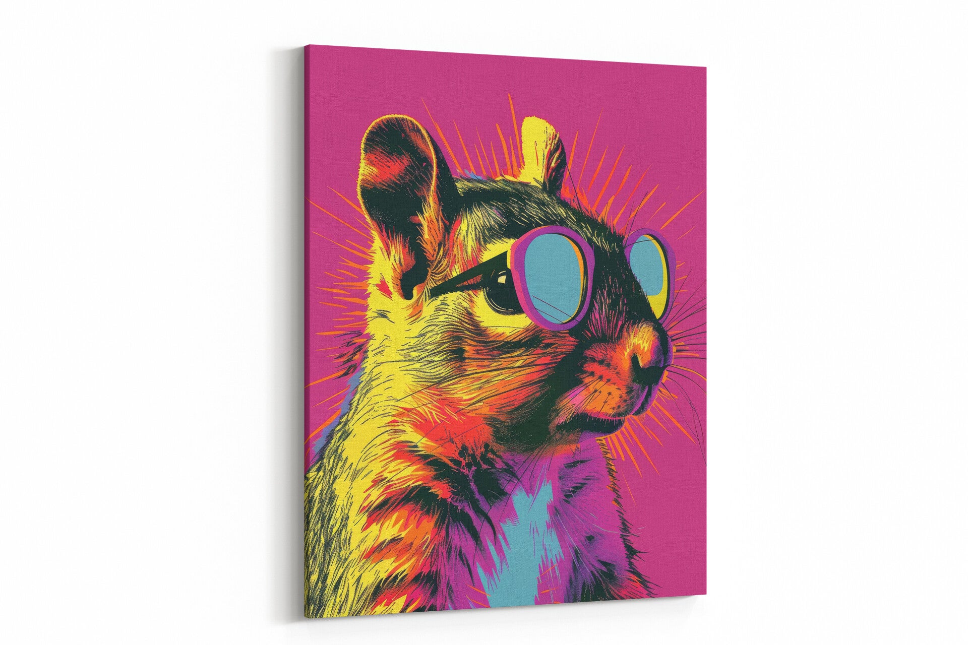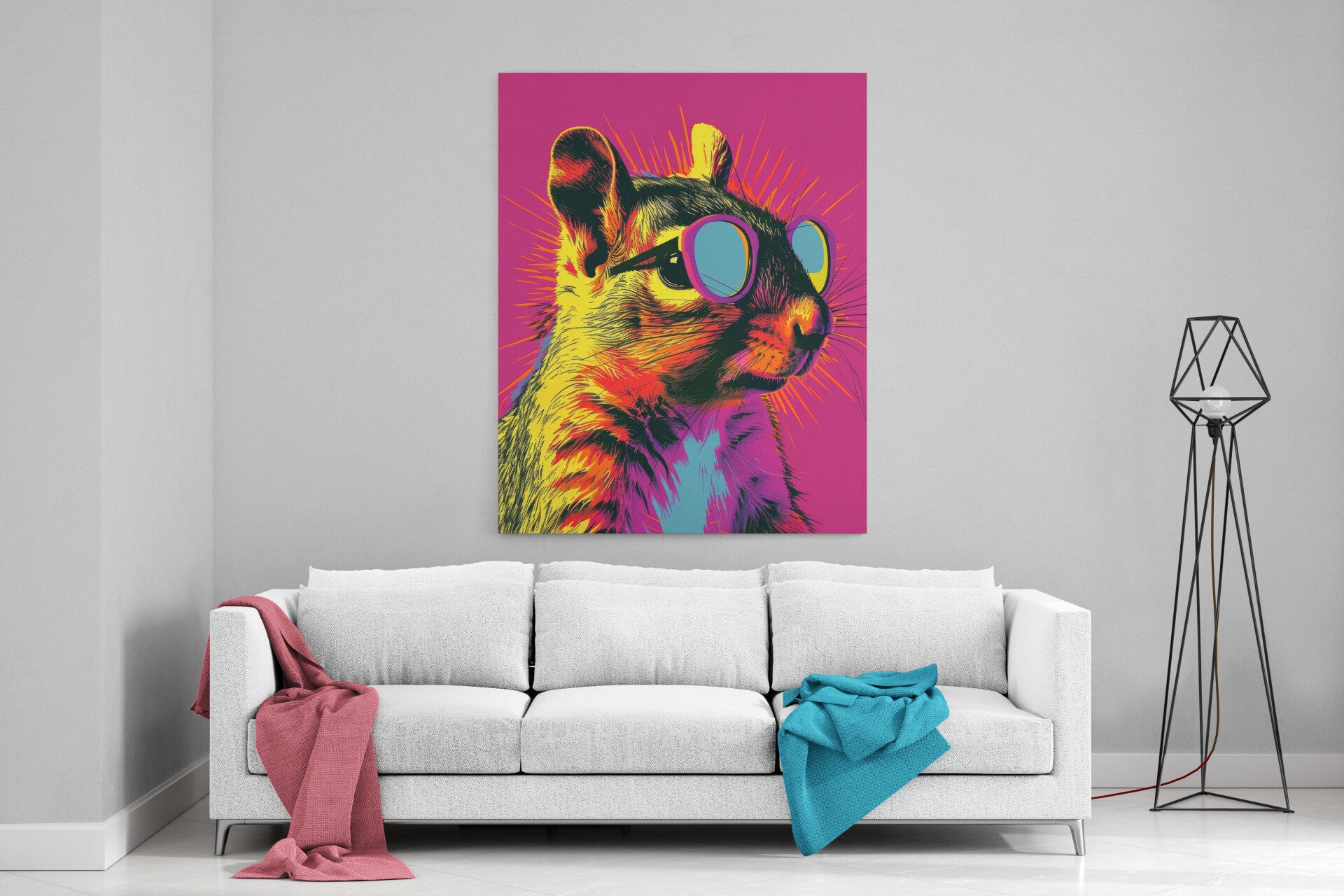 Een speelse eekhoorn met felle kleuren en een intense uitdrukking