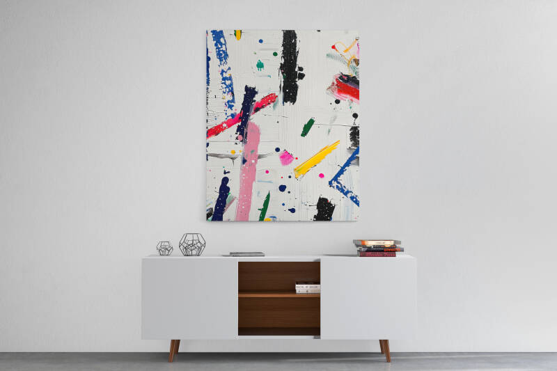 Abstracte kunst met spatten en lijnen in diverse kleuren