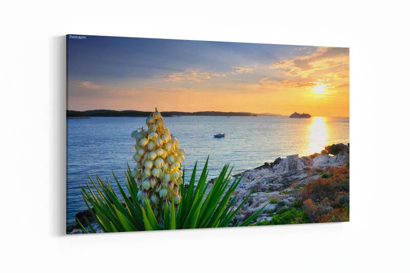Zonsondergang op het eiland Hvar met prachtige Yucca palm in bloei in Kroatië