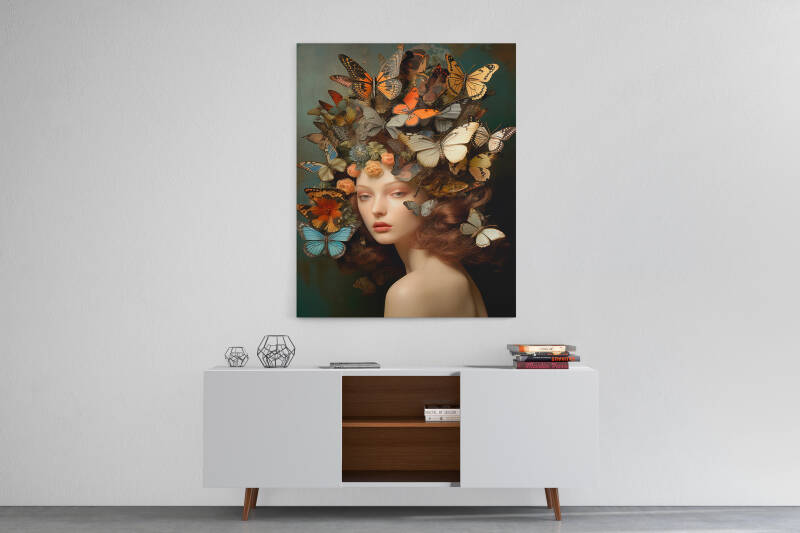 Een surrealistisch kunstwerk waarin een vrouw omringd wordt door fladderende vlinders