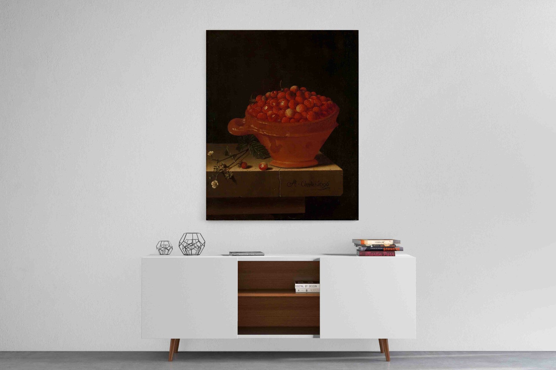 Een bakje aardbeien op een stenen plint, Adriaen Coorte