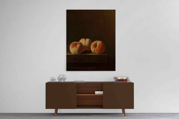 Drie perziken op een stenen plint, Adriaen Coorte