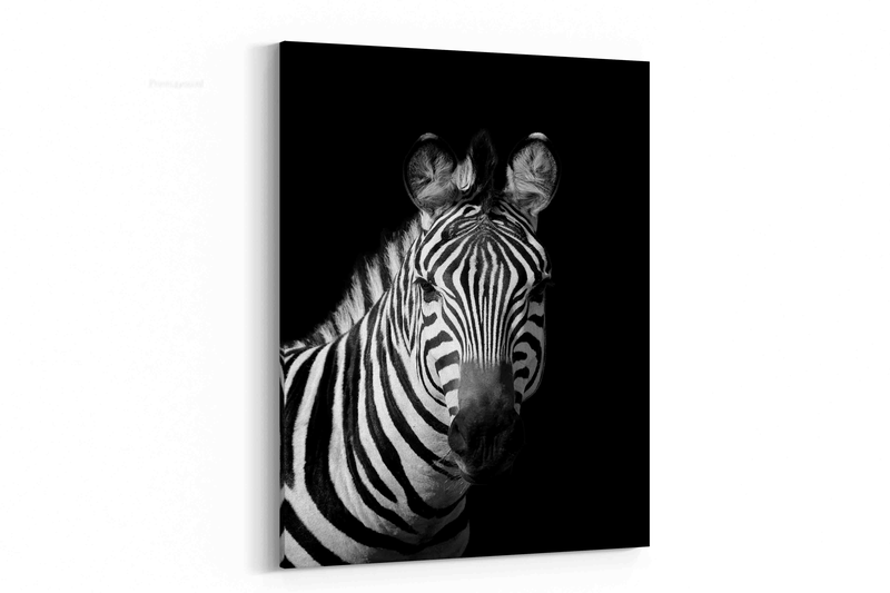 Schilderij - Zebra op donkere achtergrond. Zwart-wit