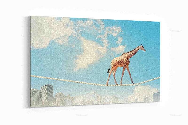 Schilderij - Giraf loopt op touw hoog in de lucht