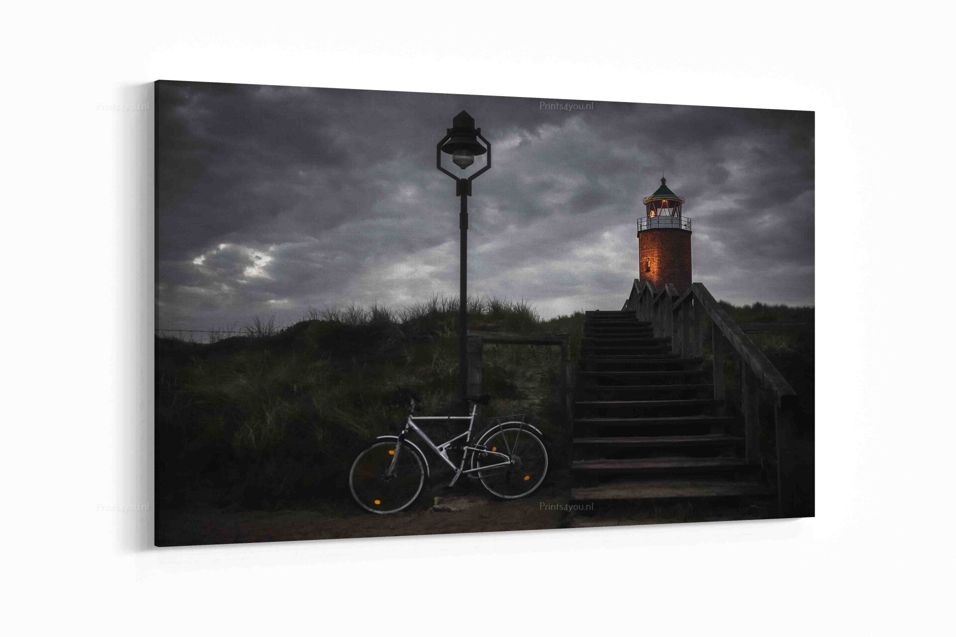 Schilderij - Landschap met een verlichte vuurtoren en een oude houten trap en fiets